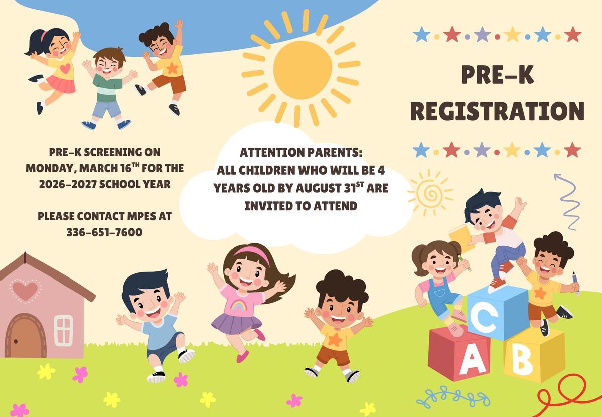 Pre-K Screening Pre-K screening on Monday, March 16th, for the 2026-2027 School Year. Attention Parents: All children who will be 4 years old by August 31st are invited to attend. Please contact MPES at 336-651-7600. Published January 12, 2026 Print